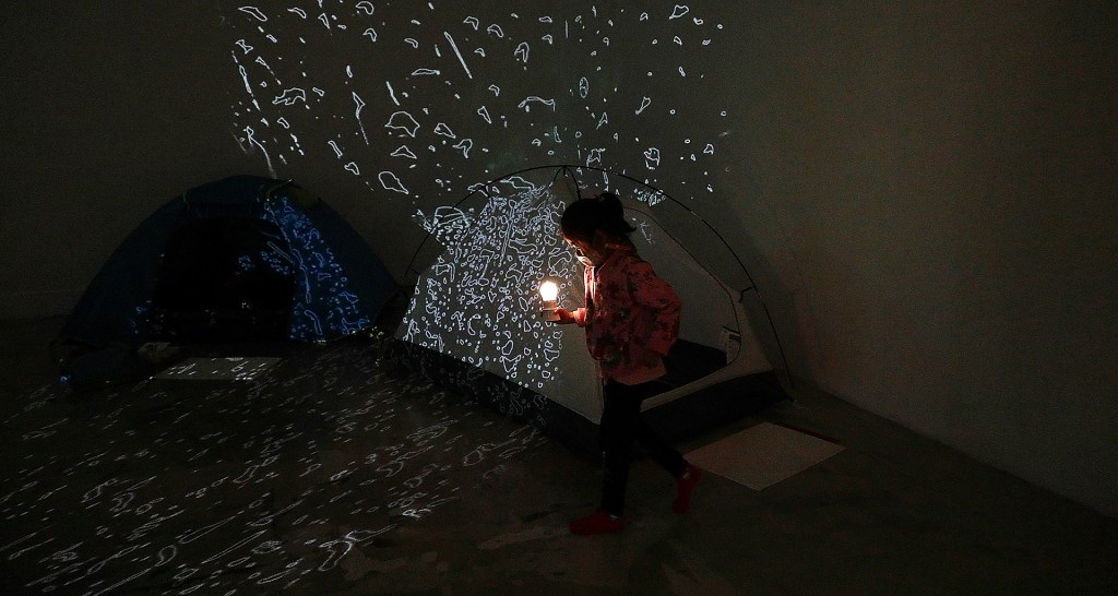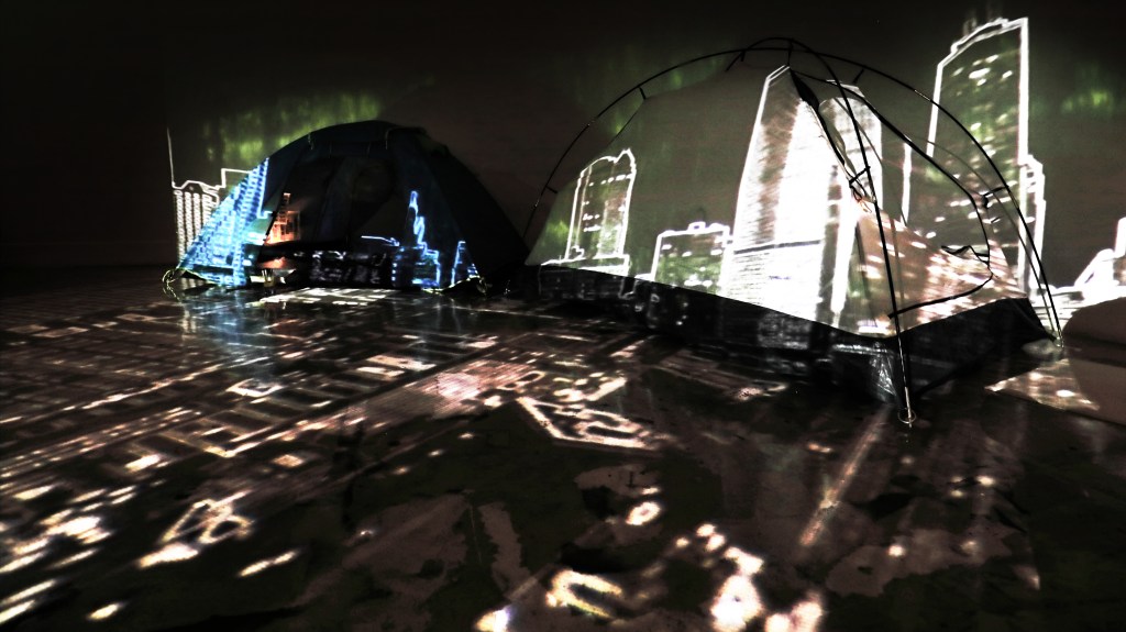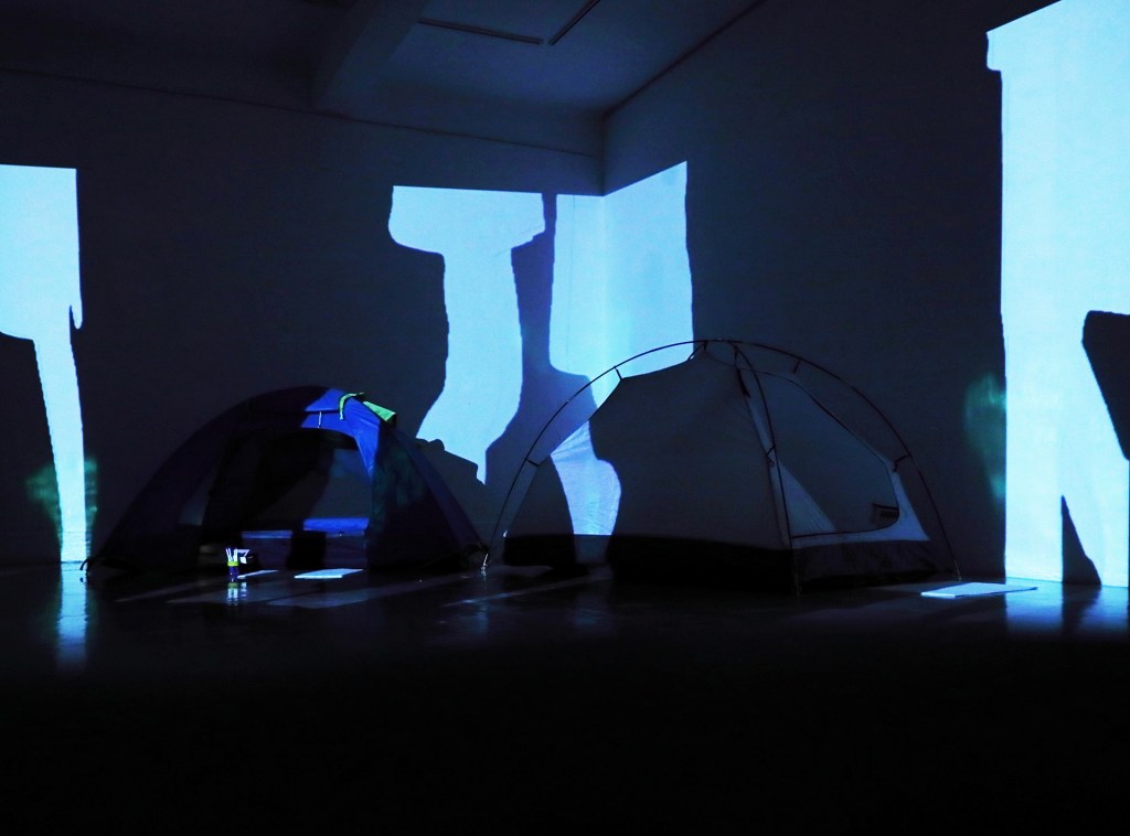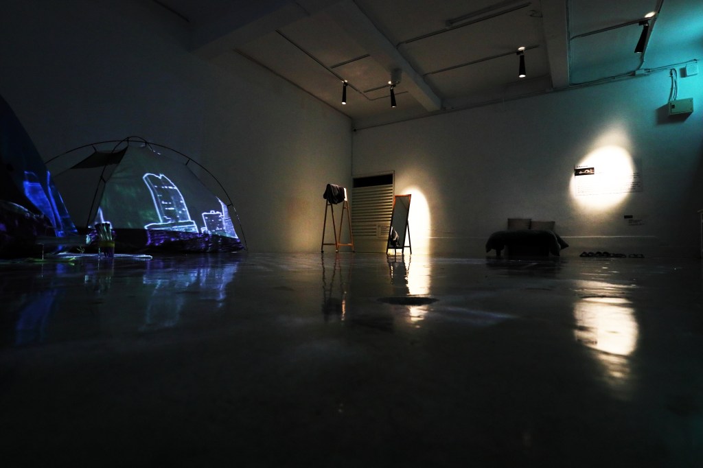 兩位創作者從各自實際居住室內帳篷的經驗出發,living in the between,既不在此處亦不在彼端,但同時也意謂著能身處任何空隙之中。一端是在遊盪之民、與當代安穩圖樣之間呈現映射,另一端則是帳篷般的高變動,提出一個個體與空間共聯/相處的視角。是「住」的重探,人與城市消費空間/安身立命空間的課題,也試著在當代社會顯影出一道如何活於其中的光影。
